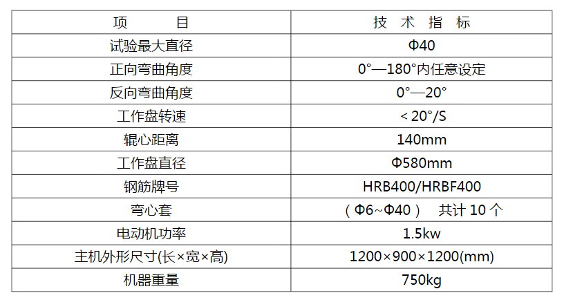 該試驗(yàn)機(jī)是對(duì)鋼筋進(jìn)行冷彎試驗(yàn)和平面反向彎曲試驗(yàn)的一種工藝設(shè)備。其主要參數(shù)符合GB/T1499.2-2007《鋼筋混凝土用圓鋼第2部分:熱軋帶肋鋼筋》和YB/T5126-2003《鋼筋混凝土用鋼筋彎曲和反向彎曲實(shí)驗(yàn)方法》中的有關(guān)規(guī)定。