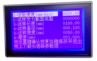 最后兩行是操作提示,其中第一行反白顯示,表示默認(rèn)的是第一行,按[↑]、[↓]鍵可在多個(gè)選項(xiàng)里變換,這些選項(xiàng)都是前一步選擇所需要的參數(shù),前一步的選擇不同,本屏選項(xiàng)的內(nèi)容和數(shù)目也不同。用[↑]、[↓]鍵選中某個(gè)選項(xiàng),則該選項(xiàng)反白顯示,這時(shí)按[設(shè)置]鍵,則該選項(xiàng)內(nèi)容的最后一位閃爍顯示,表示該位可以修改,按[↑]、[↓]鍵則該位在0-9之間變化,按[←]鍵則前移一位閃爍顯示,該項(xiàng)的內(nèi)容修改完畢后按[設(shè)置]鍵,則數(shù)字停止閃爍,整個(gè)參數(shù)項(xiàng)繼續(xù)反白顯示,這時(shí)按[↑]、[↓]可以選擇其他參數(shù)項(xiàng)。當(dāng)所有的參數(shù)修改完畢后按[復(fù)位]鍵,則保存剛才所有的修改并進(jìn)入到正常試驗(yàn)狀態(tài)